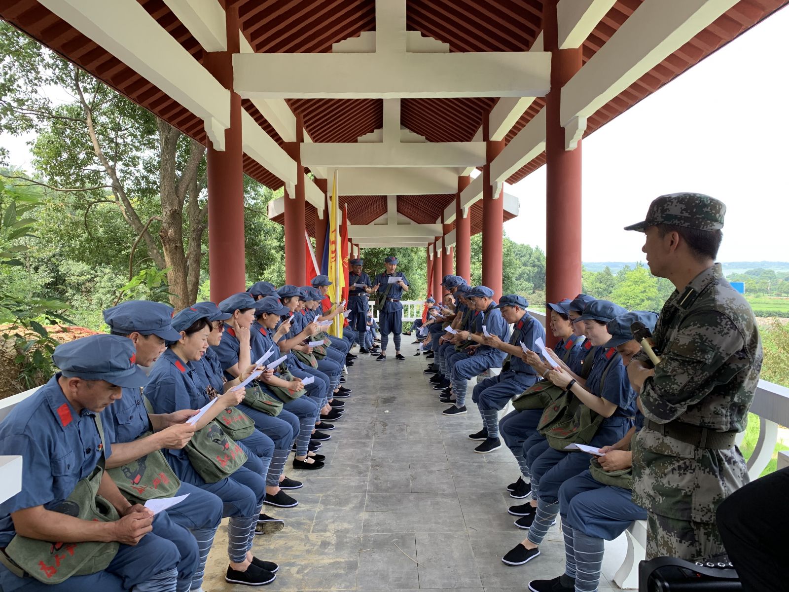 全体人员不畏酷暑,斗志昂扬。穿红军服装,走红军小路,高唱红色歌曲,聆听革命故事,瞻仰英雄雕像,在鲜艳的党旗下向革命先烈敬献花篮,重温入党誓词。